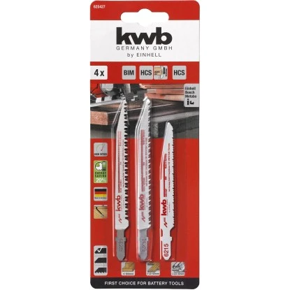 Das kwb by Einhell Stich-Sägeblatt-Set 4-tlg. ist ein passendes Zubehör für diverse Einhell Stichsägen. Das Set beinhaltet 4 verschiedene Sägeblätter für ideale Schnittergebnisse – und das mit Qualität made in Germany. Im Set enthalten ist ein BIM-Sägeblatt für Holz bis 10 cm Schnitttiefe. Ebenfalls enthalten sind 2 HCS-Sägeblätter mit besonderer Verzahnung: Hier können besonders saubere, schnelle und klare Schnitte in 1,5 bis 40 mm dickes Holz ausgeführt werden. Das weitere HCS-Sägeblatt kann für Metall oder Kunststoffe mit einer Stärke zwischen 2,5 und 10 mm eingesetzt werden. Alle Sägeblätter sind dank ihres Schliffs besonders effizient und können höhere Schnittgeschwindigkeiten ausführen. Das schont zum Beispiel die Laufzeit eines Akkugeräts.